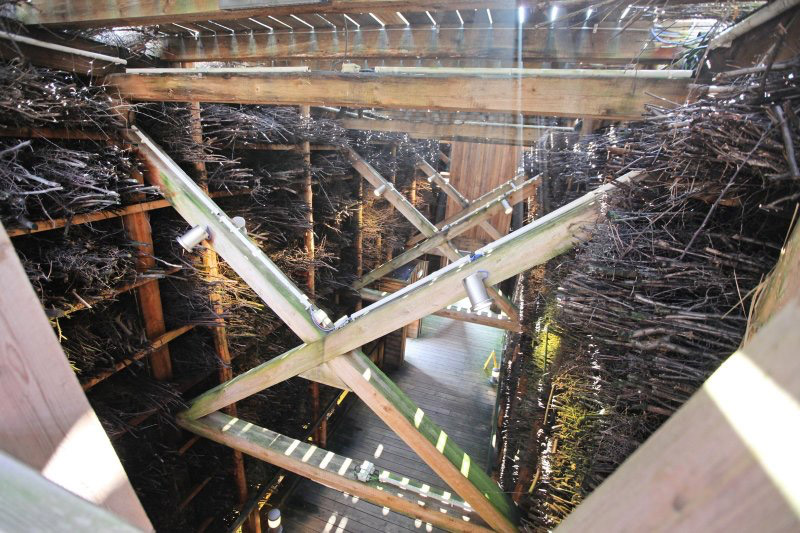 Das Gradierwerk am Kurparkeingang ist begehbar. Im Inneren herrscht Ruhe. Durch die verschachtelten Holzkonstruktionen brechen vereinzelte Sonnenstrahlen in das erlebbare Werk, an den Geländern sammeln sich Salzreste aus der Luft – so könnte man sich ein tropisches Baumhaus vorstellen. „Im Sommer ist es hier angenehm kühl", verrät Siekmann. Der perfekte Ort für Heuschnupfengeplagte also.